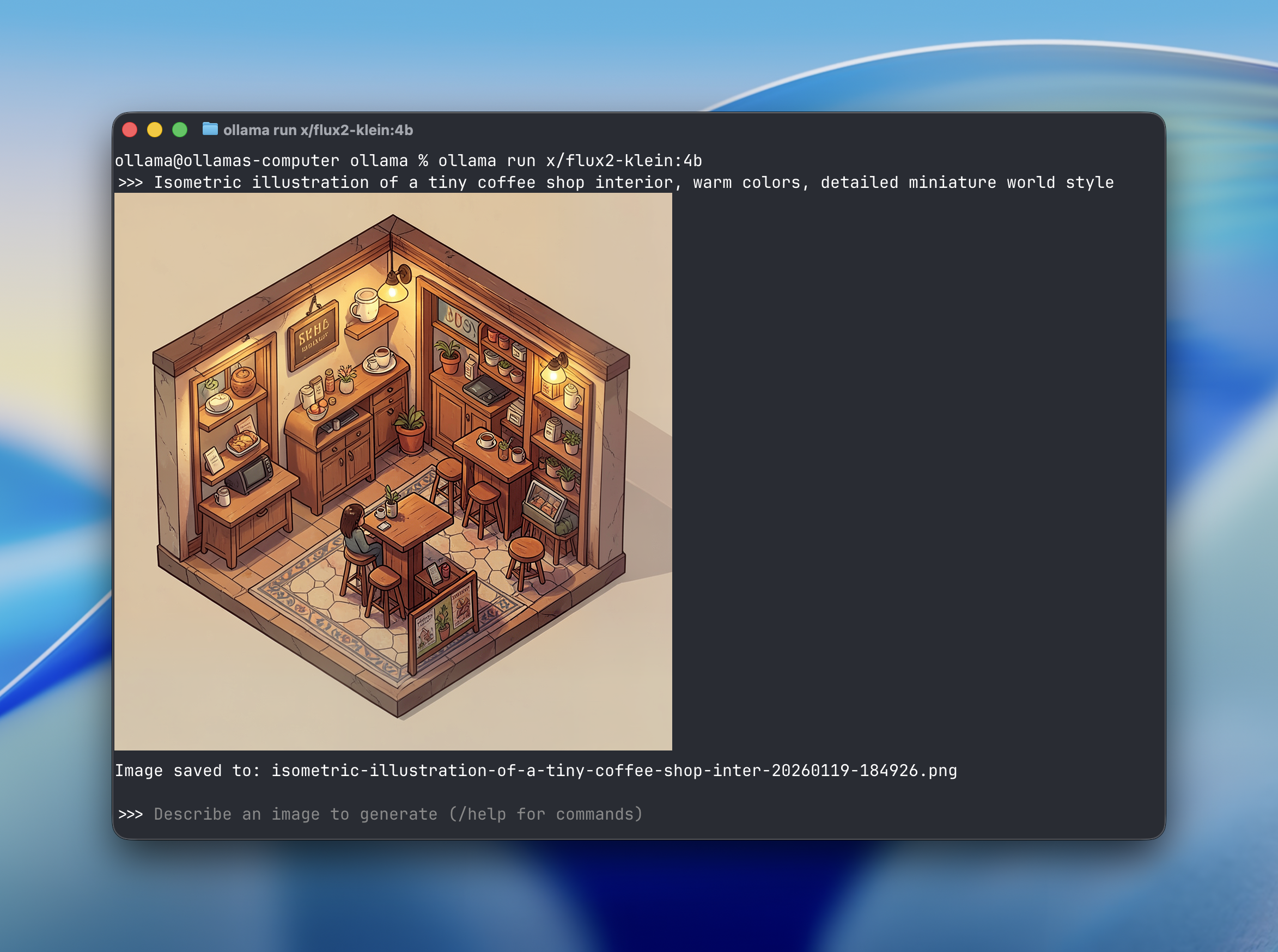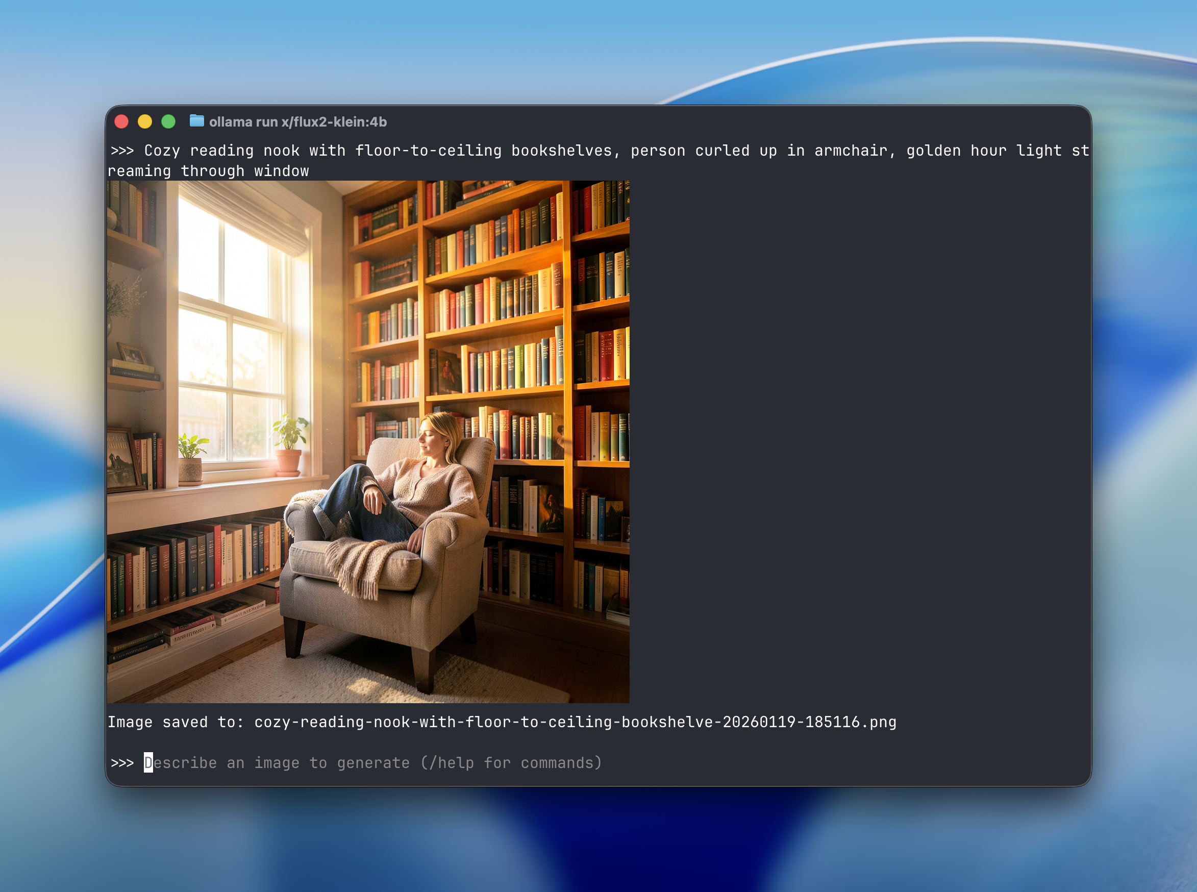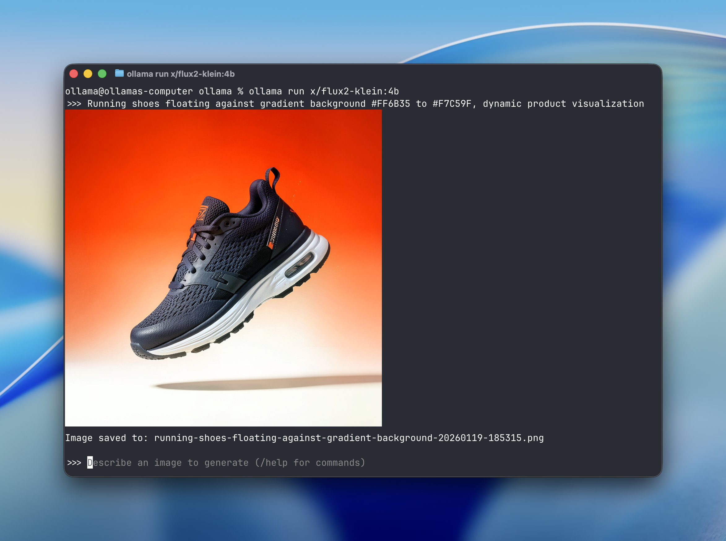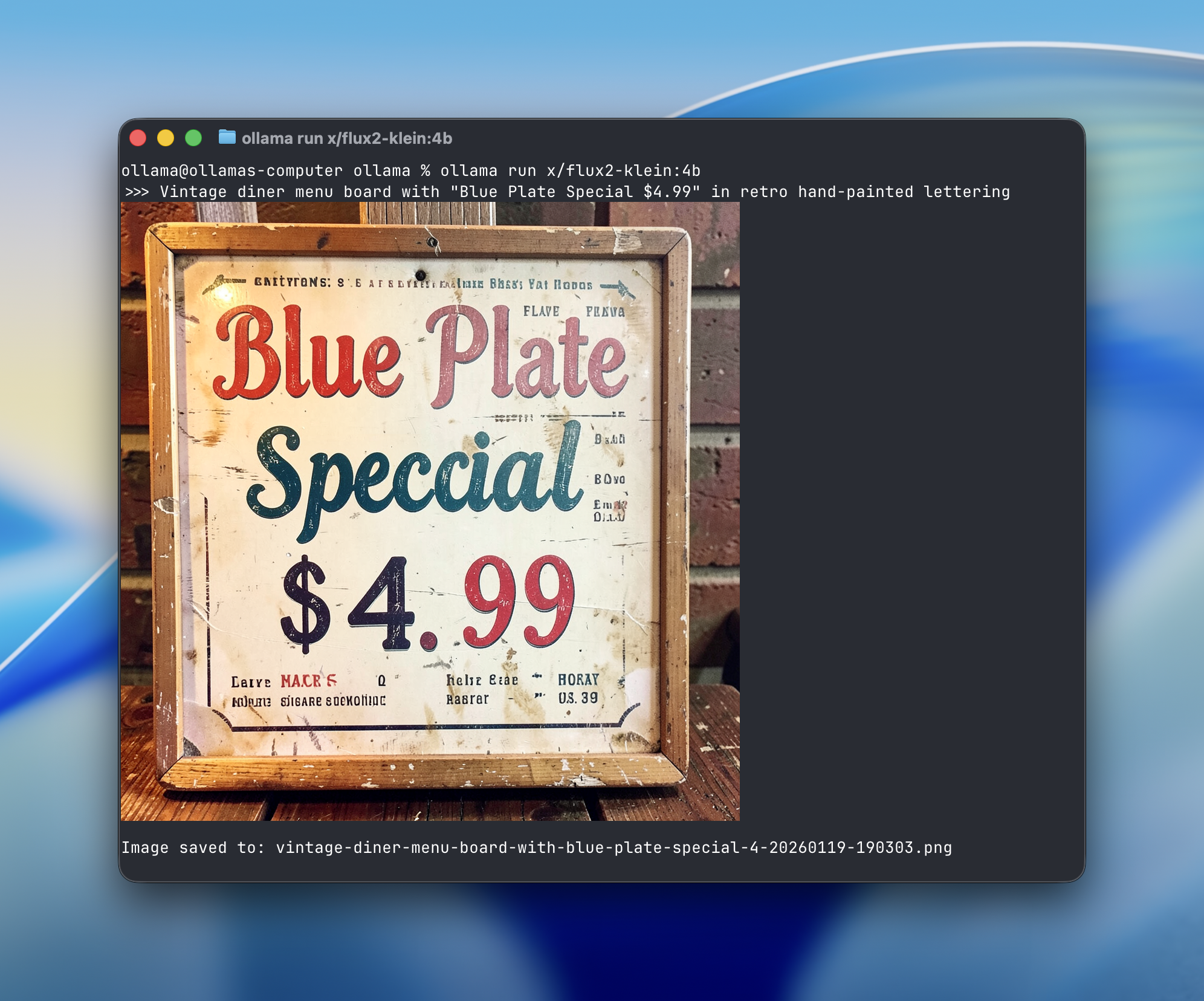 ollama run x/flux-klein "a cat holding a sign that says hello world"