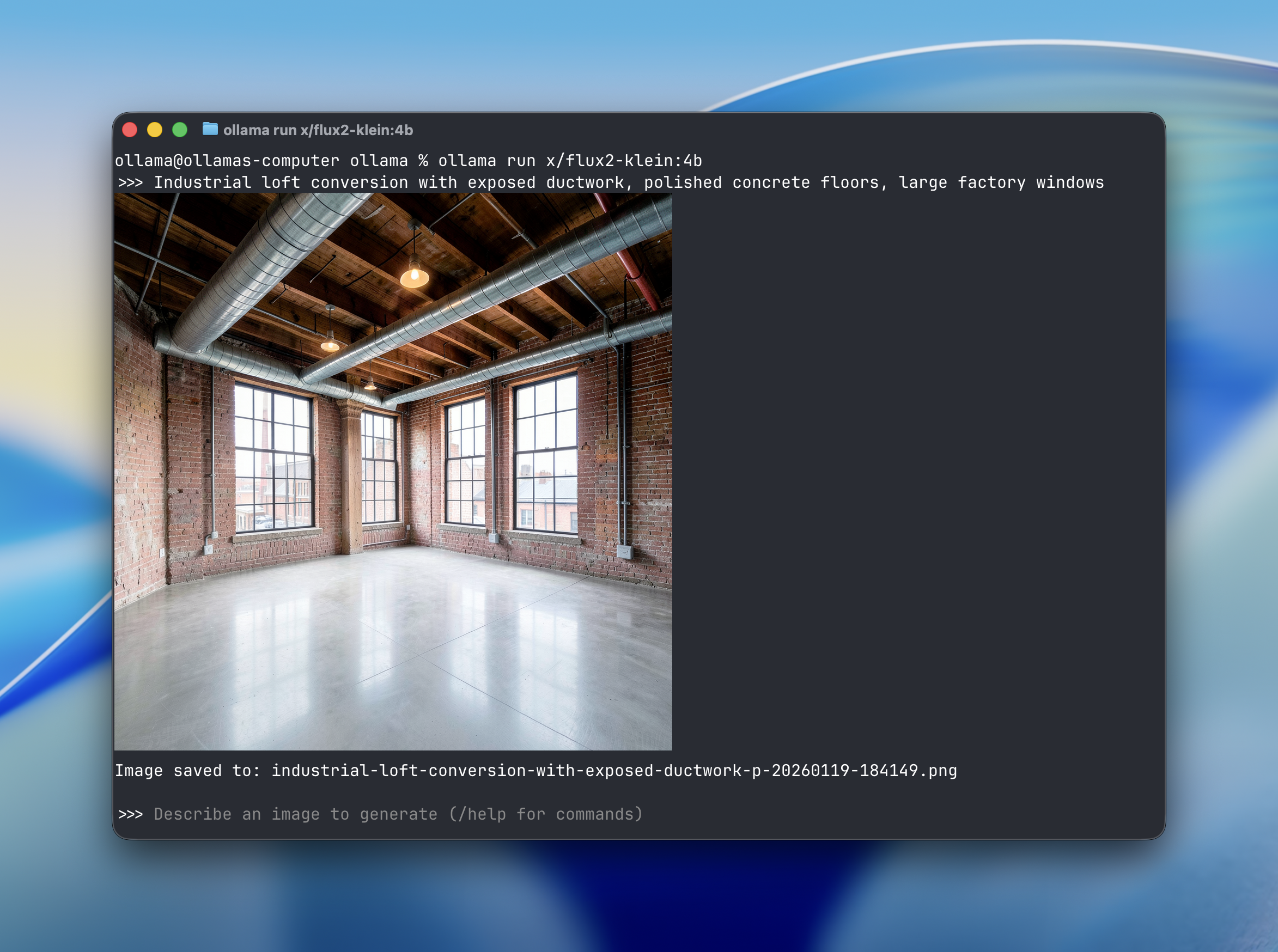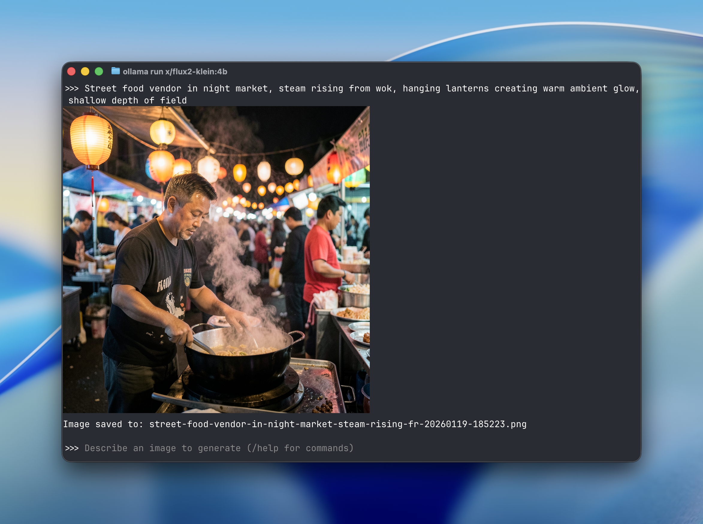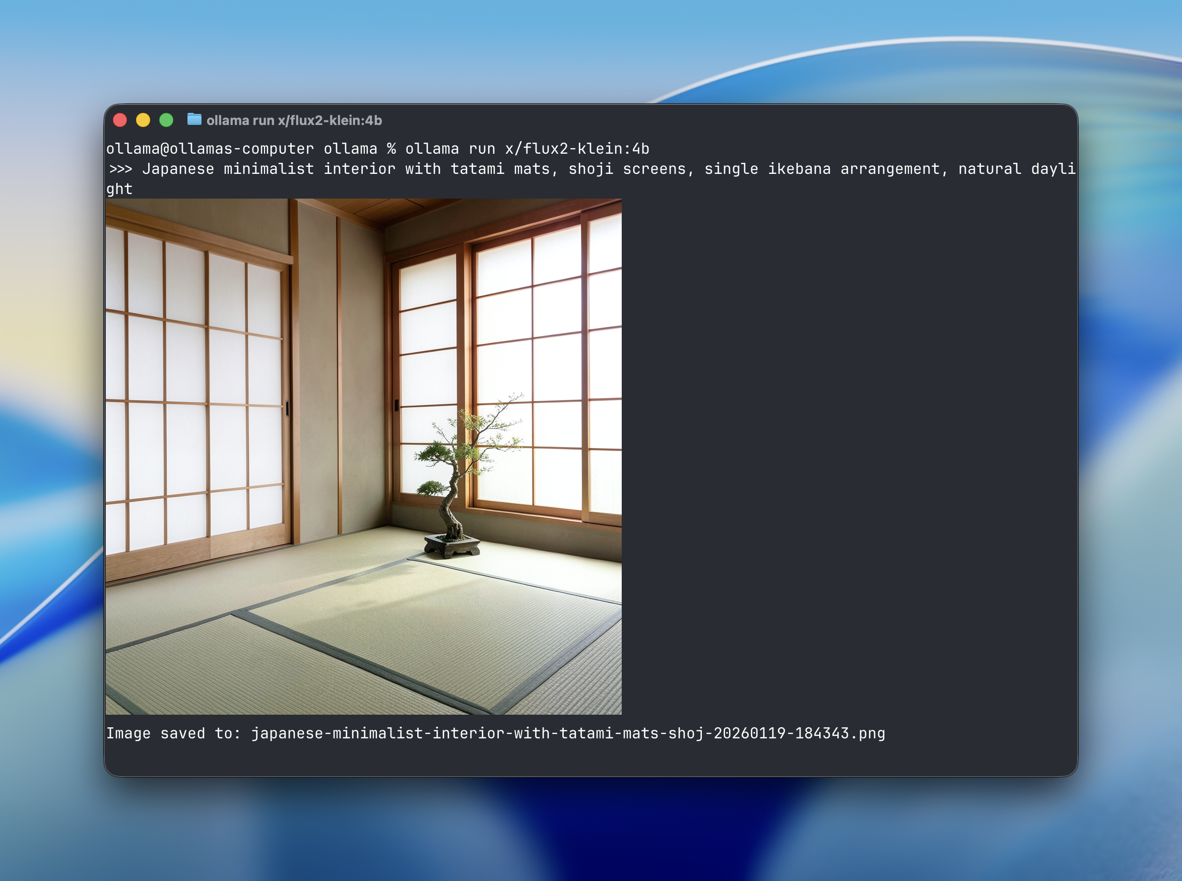 ollama run x/flux-klein "a cat holding a sign that says hello world"