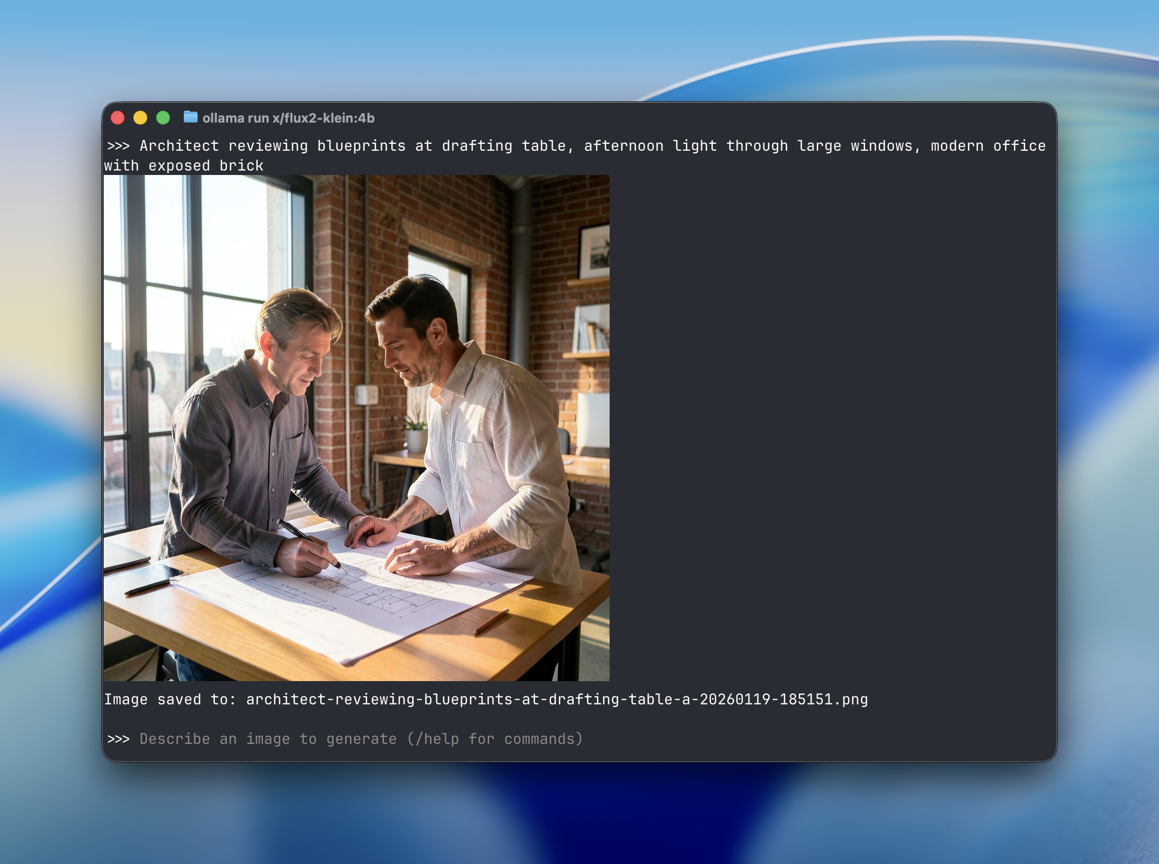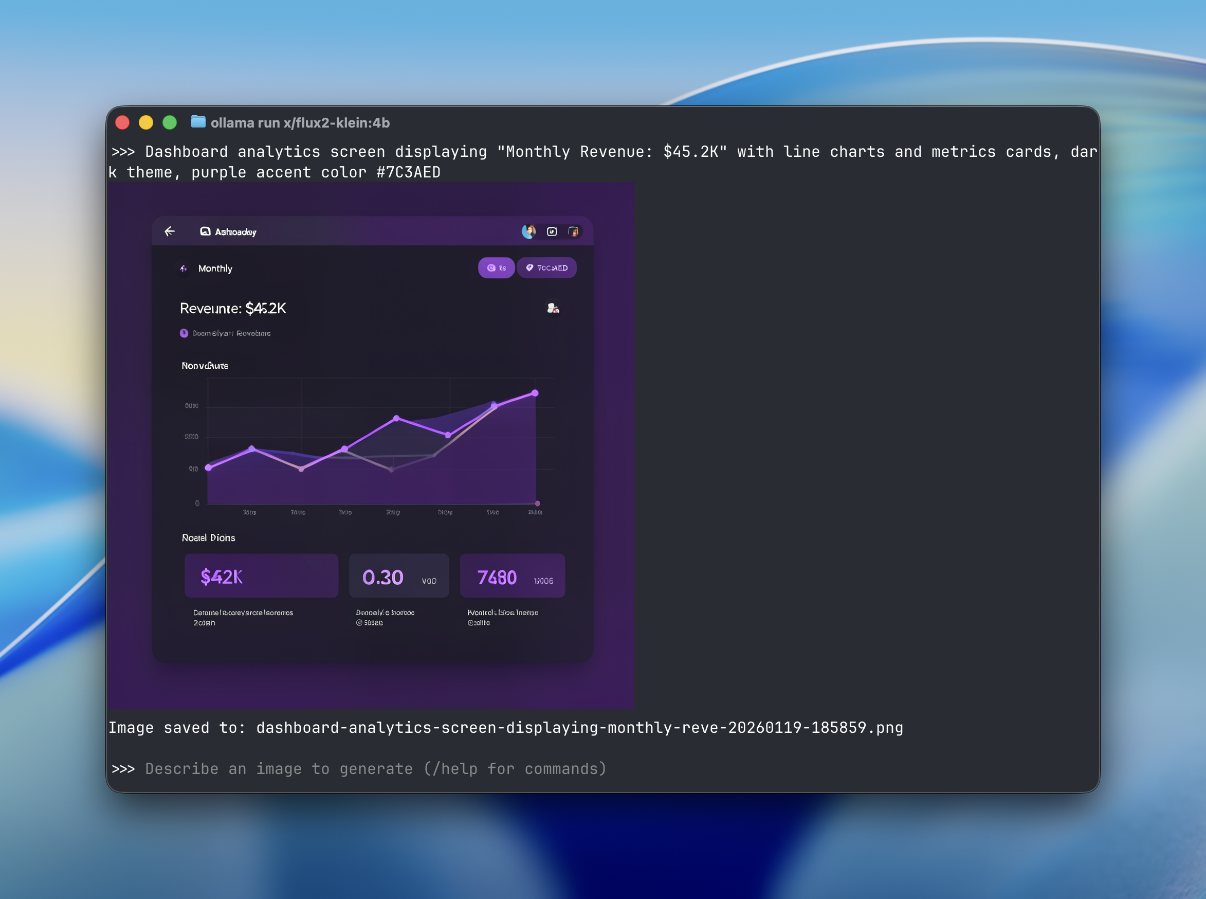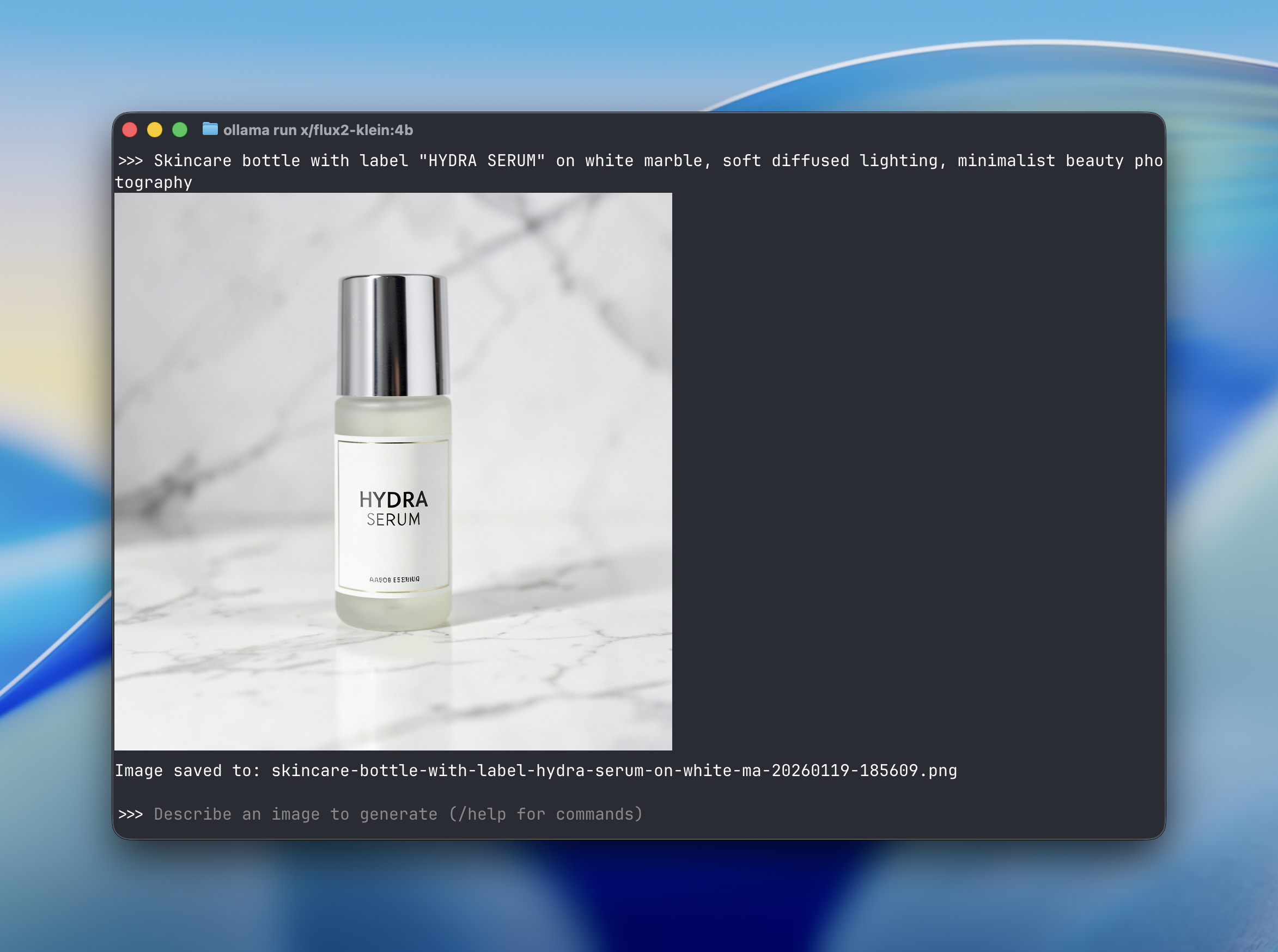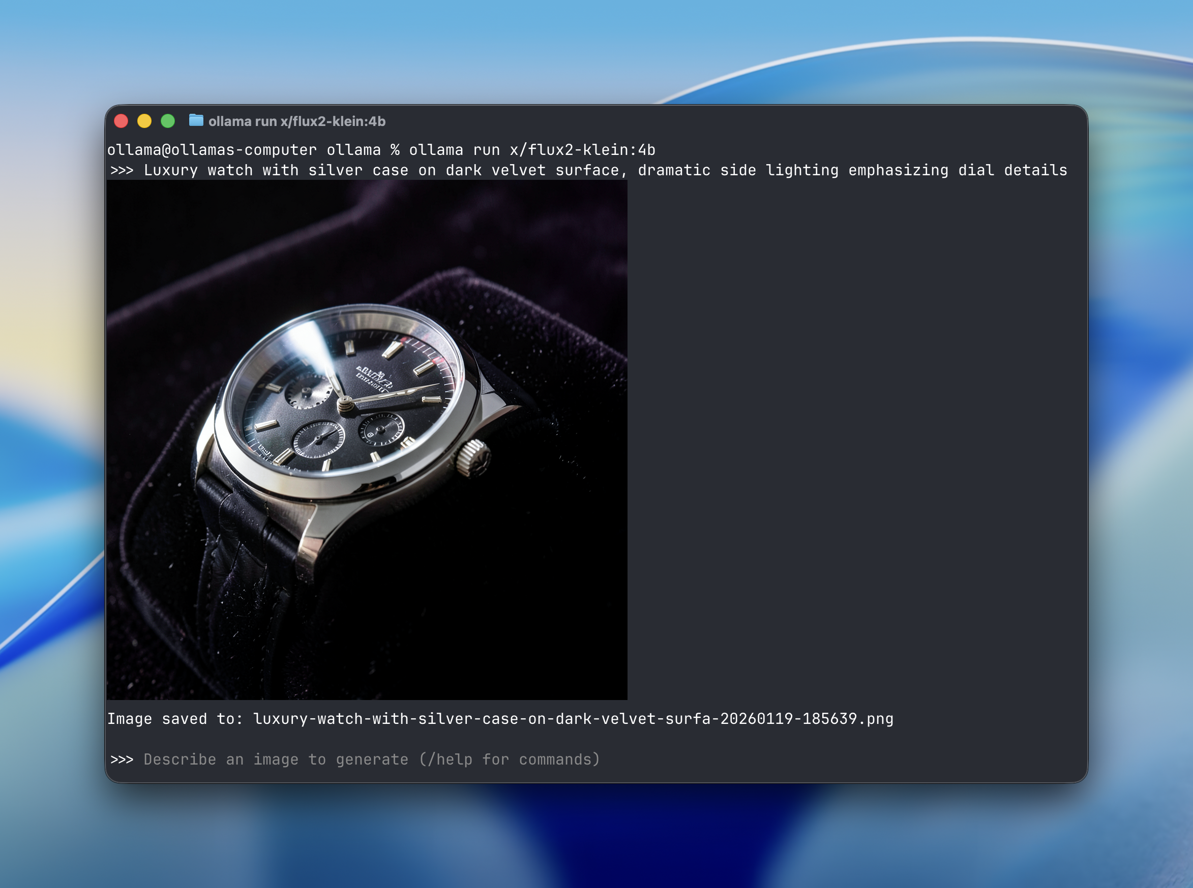 ollama run x/flux-klein "a cat holding a sign that says hello world"